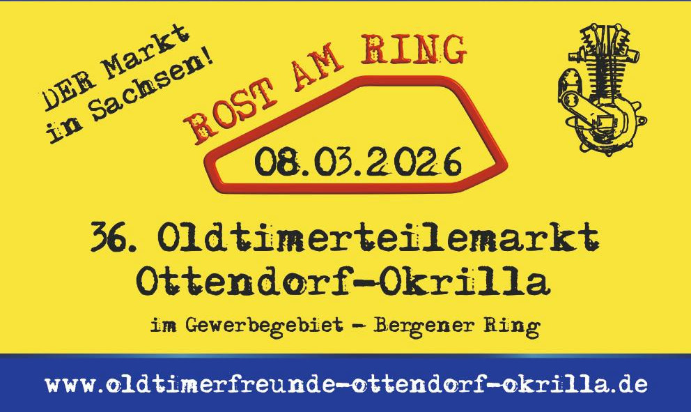 Euch allen die Ihr schon auf unsere Mitteilung gewartet habt. Am 8.3. ist es wieder soweit, wir laden zum 36. Rost am Ring ins Gewerbegebiet Ottendorf Okrilla ein. Bereits 5 Uhr öffnen wir für Besucher. Wir freuen uns auf ein reges Markttreiben , angenehme Gespräche und gute Geschäfte.
